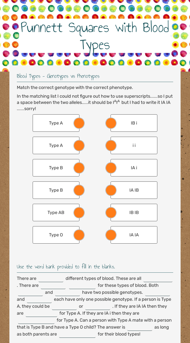 In this worksheet, the students will create punnett squares to determine the likelihood of certain genotypes and phenotypes in monsters. Worksheet that distinguishes between genotype and phenotype. The combination of genes the organism has is called genotype if the . If you don't understand these terms . Genotype= the actual genetic makeup (the genes) of an individual.